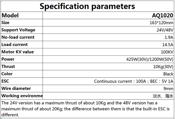 48V version, the thrust of 1 thruster is 24Kg, and the total thrust of 2 thrusters is 24*2=48kg.